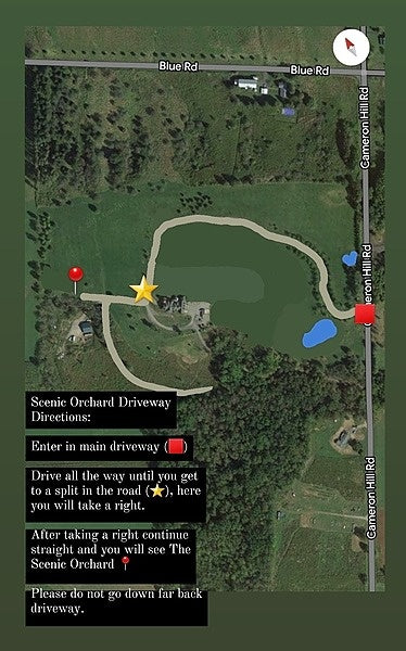 You will enter the main driveway and drive a little less then half a mile until you come to a split in the driveway (yellow star on map). At the first split, please take a right. After, you will drive straight and will see The Scenic Orchard (red pin on map). Please refrain from using the back property driveway as this leads to Hickory Outlook (not your getaway).